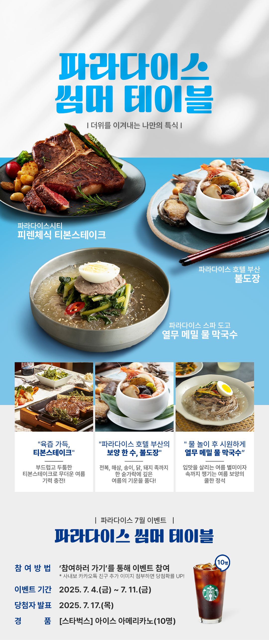 무더위를 이겨내는 나만의 보양식, 파라다이스 특선 메뉴로 여름 에너지를 충전하세요!