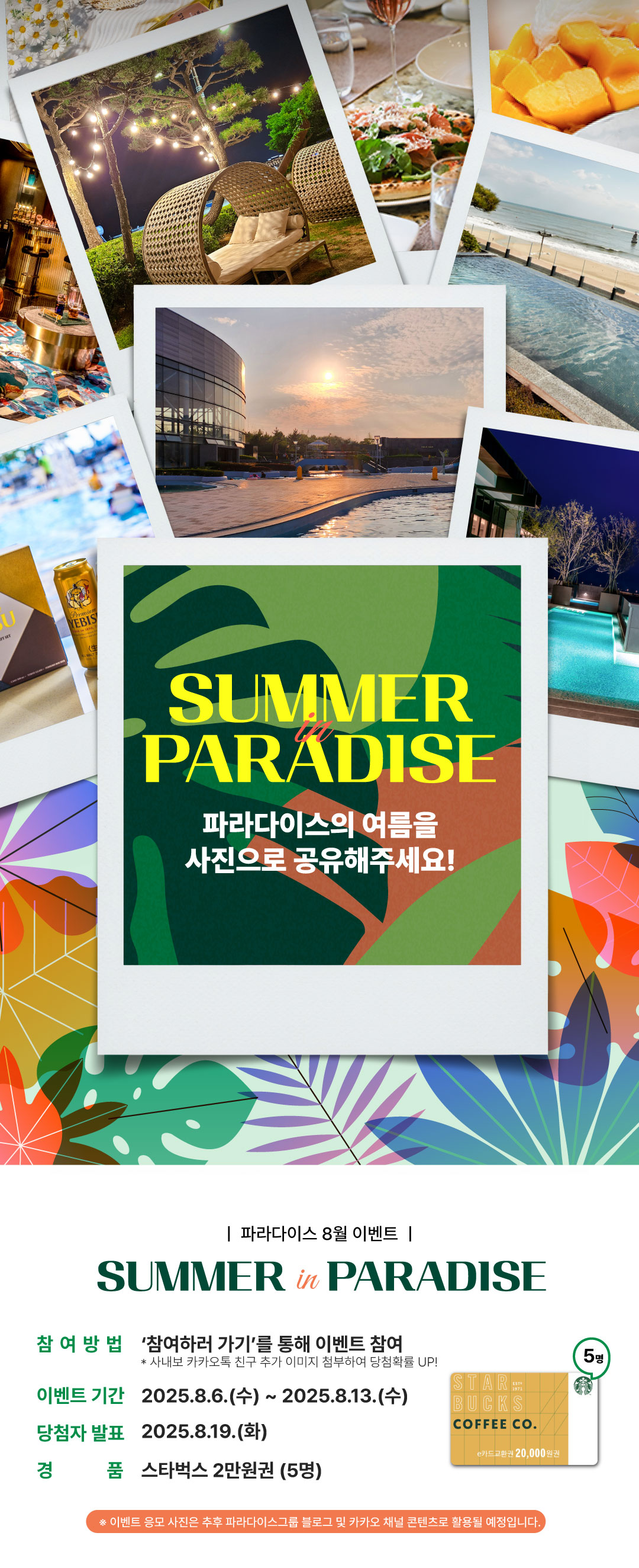| [8월 사보 이벤트/당첨자 발표] Summer in Paradise : 파라다이스의 여름을 사진으로 공유해주세요! (0) | 2025.08.19 |