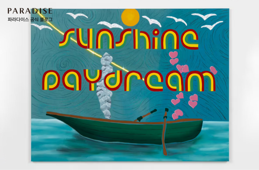 파라다이스시티에서 선보이는 이번 전시는 ‘Earth(땅)·Water(물)·Sky(하늘)’라는 세 가지 테마로 구성됩니다. 생명의 시작을 상징하는 3m 크기의 설치 작품 <Tree of Life>가 입구에서 관람객을 맞이하고, ‘Water(물)’을 테마로 한 1층은 회화 <Sunshine Daydream>과 함께 벽면 월페이퍼, 대형 비치볼 등으로 구성됩니다. 2층은 금박 타이포그래피 풍선이 돋보이는 <Paradise with Blossoms>와 안락의자 등의 설치작품이 자신의 존재와 평온에 대해 사색할 수 있는 순간을 선사합니다.
