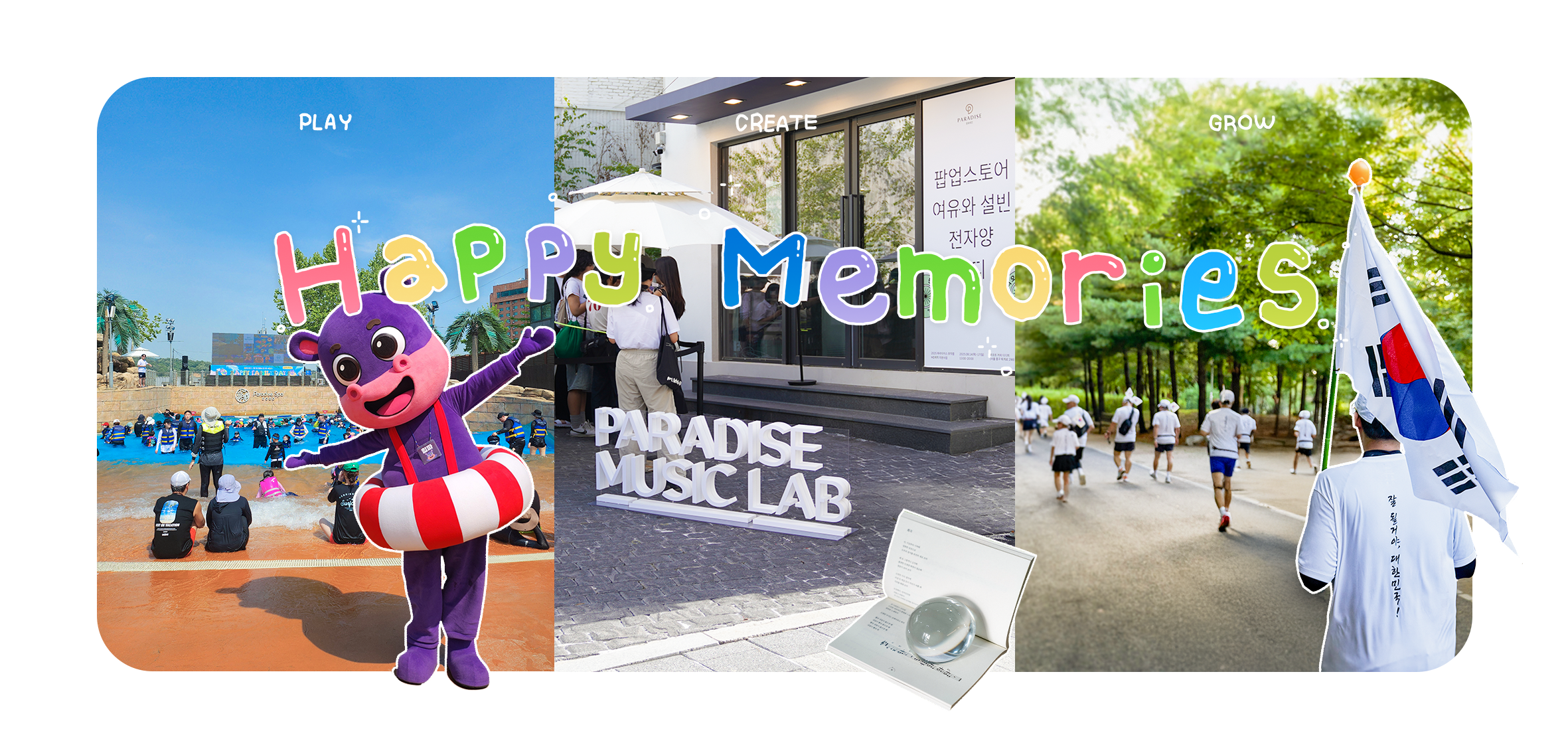 태양의 열기가 절정을 향해 달리던 8월, 파라 커넥터들이 전하는 ‘해피 메모리즈(Happy Memories)’와 함께 파라다이스 현장 곳곳의 특별한 모습을 만나보세요. 이번 이야기는 파라다이스 스파 도고의 사랑스러운 마스코트 ‘힙파’와 함께한 하루부터, 아티스트와 팬을 더욱 가깝게 이어준 ‘파라다이스 뮤직랩’ 팝업스토어, 그리고 광복 80주년을 기념해 임직원이 하나 되어 달린 ‘815 런’까지 다채로운 소식을 담았습니다. 뜨거운 감동과 잊지 못할 추억이 함께했던 순간들을 지금 바로 만나볼까요?