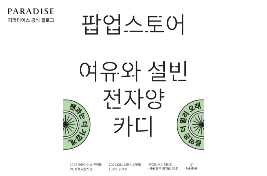파라다이스 뮤직랩 MD 제작 지원사업 <여유와 설빈, 전자양, 카디 팝업스토어>는 파라다이스문화재단이 새롭게 선보인 음악 분야 지원사업으로, 아티스트의 MD 제작부터 오프라인 만남까지 아티스트와 팬이 연결될 수 있도록 지원하는 자리였습니다. 108팀의 지원자 중  여유와 설빈, 전자양, 카디 총 세 팀의 아티스트가 최종 선정되어, 8월 14일부터 17일까지 서울 중구의 루프트 커피 디디피에서 개성 있는 프로그램으로 팬들과 소통의 시간을 가졌습니다.
