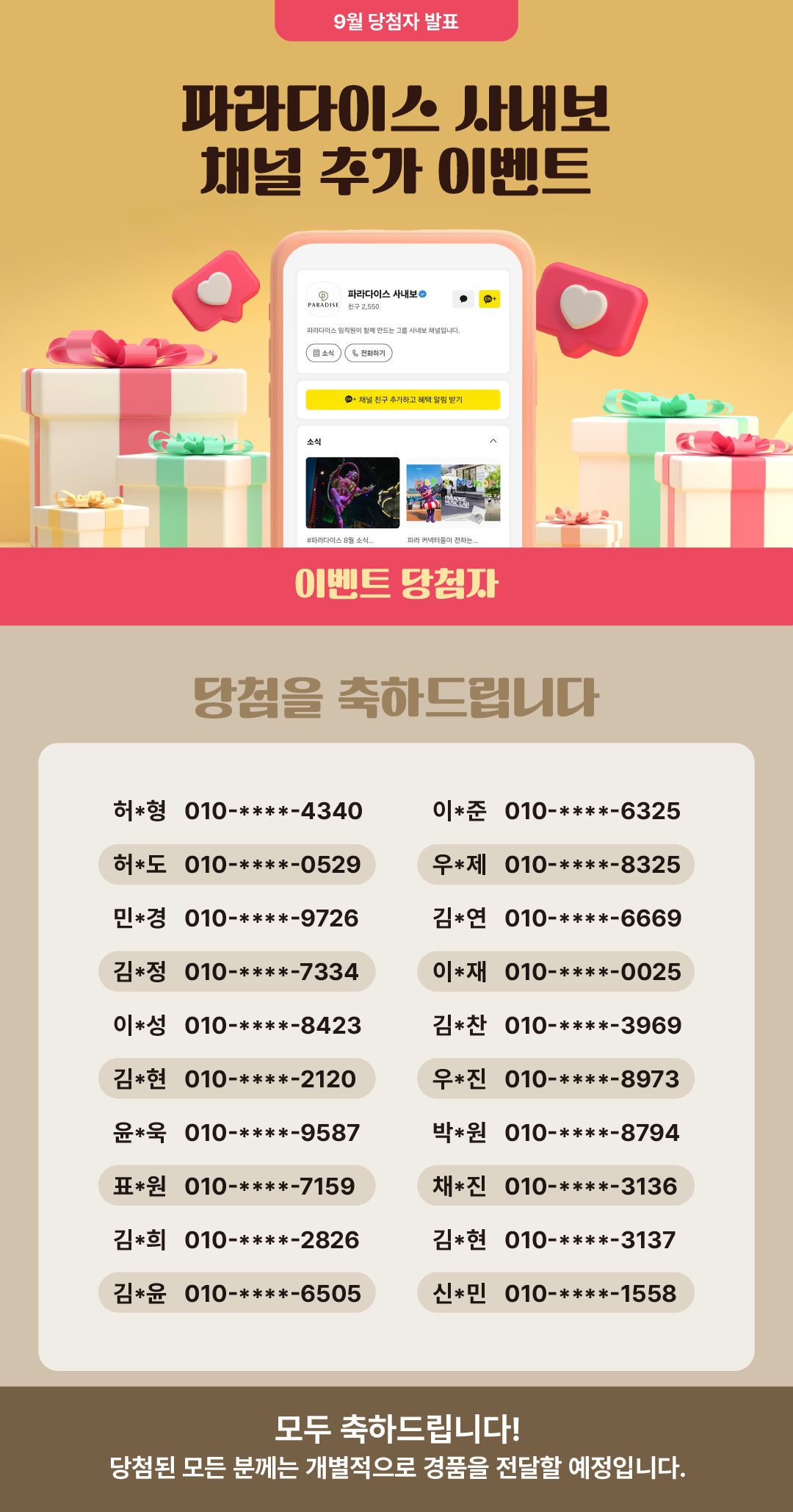 파라다이스 사내보 채널 친구 추가 이벤트 당첨자 발표!