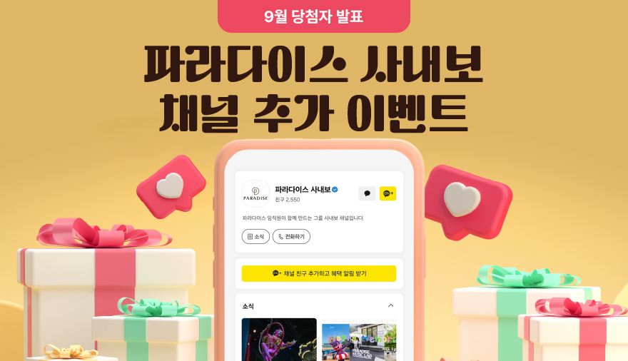 | [9월 사보 이벤트] 파라다이스 사내보 채널 친구 추가 이벤트 (0) | 2025.09.08 |