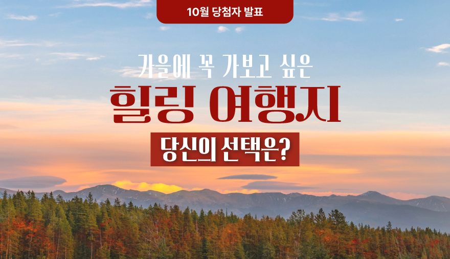“이번 가을엔 어디로 떠나볼까?”라는 설렘 가득한 마음으로 진행된 ‘가을에 꼭 가보고 싶은 힐링 여행지’ 투표 이벤트에 많은 관심과 참여를 보내주셔서 진심으로 감사드립니다.