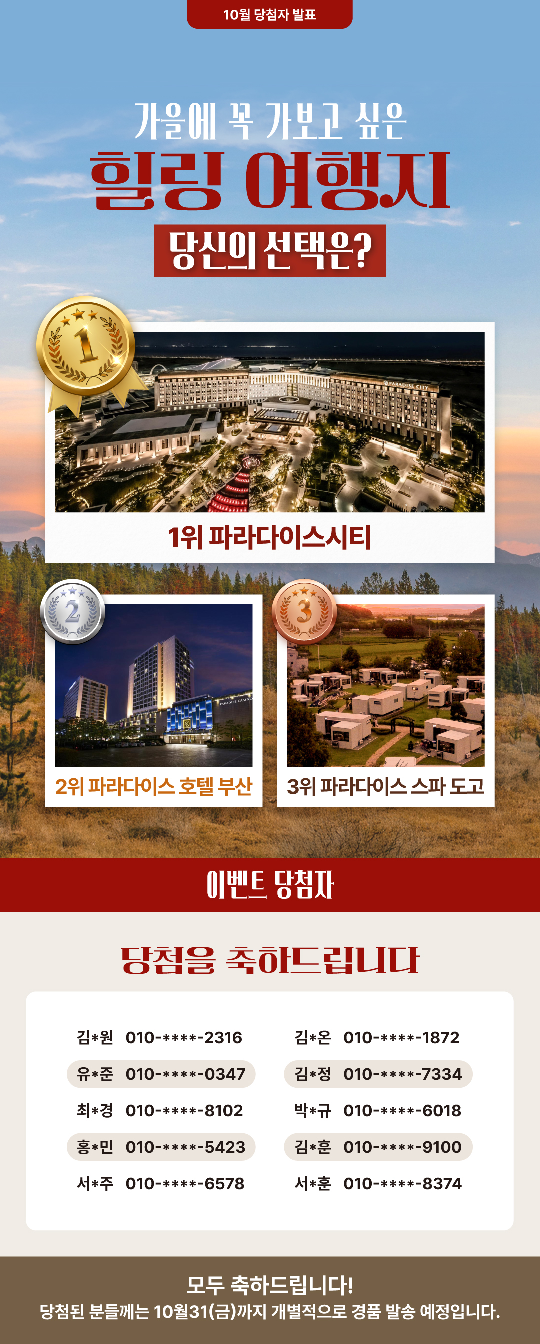 | 파라다이스그룹 10월 블로그 이벤트 (2회차) & 1회차 당첨자 발표 (8) | 2025.10.21 |