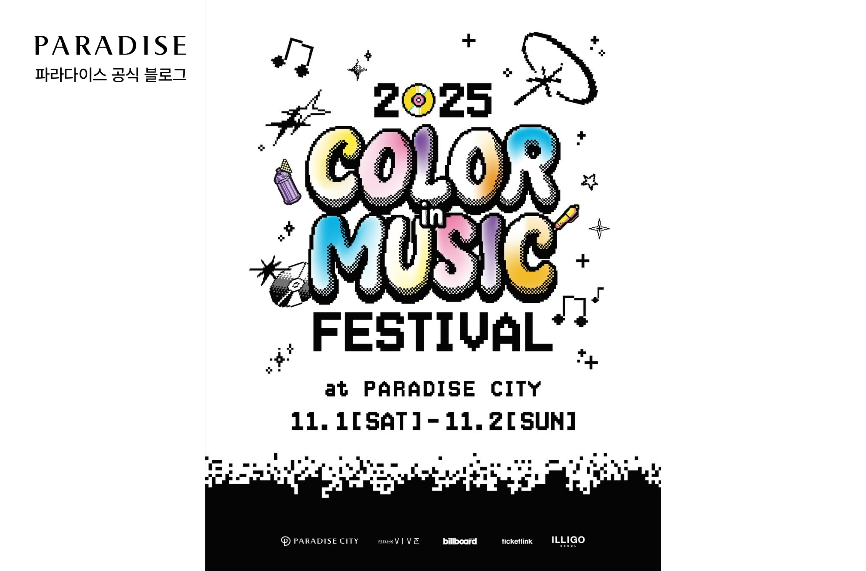 이어 오는 11월 1일과 2일, 파라다이스시티에서는 또 한 번의 대형 음악 축제 ‘2025 컬러 인 뮤직 페스티벌'가 개최됩니다. 빌보드코리아가 주최하고 필링바이브가 주관하는 이번 페스티벌은 ‘음악과 색(컬러)의 조화’를 주제로, 각 아티스트의 개성과 감성을 색으로 표현하는 무대를 선보일 예정입니다. 라인업에는 보이넥스트도어와 이영지가 헤드라이너로 참여하며, 이소라, 크러쉬, 윤미래, 타이거JK, 비비, 잔나비, 우즈등 베테랑 아티스트부터 82메이저, 베이비돈크라이같은 신예 루키까지 총출동합니다. 세대를 아우르는 아티스트들이 만들어낼 무대는 감성 보컬부터 강렬한 힙합, 청량한 밴드 사운드까지 다채로운 스펙트럼으로 펼쳐질 예정입니다. 파라다이스시티는 앞으로도 예술과 문화, 음악이 조화를 이루는 아트테인먼트 리조트로서, 모두가 함께 즐길 수 있는 다양한 콘텐츠를 지속적으로 선보일 계획입니다.