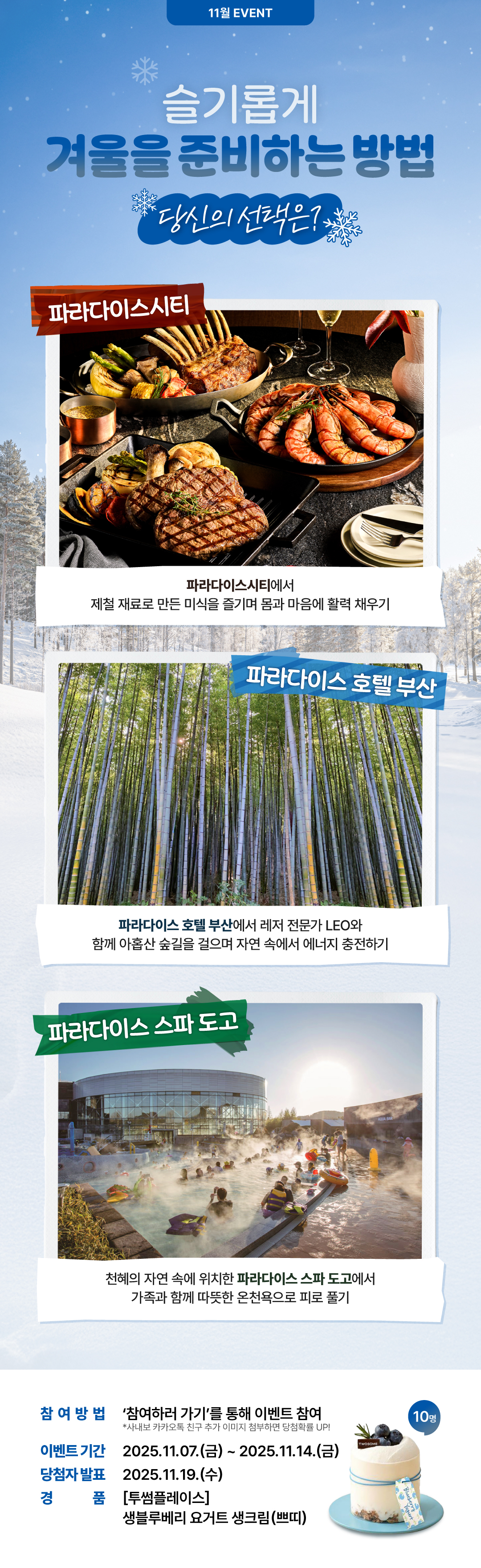 찬 바람이 스며드는 계절, 겨울이 성큼 다가왔습니다. 하루의 무게를 내려놓고, 마음을 다독이고 싶은 요즘, 여러분은 어떤 방식으로 재충전하시나요? 파라다이스가 제안하는 세 가지 방식 가운데, 나의 취향에 맞는 경험을 골라주세요. 이벤트에 참여하시면 추첨을 통해 소정의 선물을 드립니다. 😊