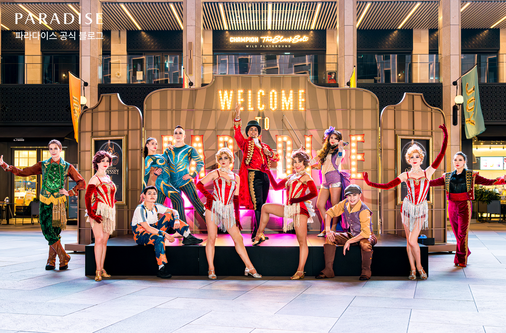 플라자에서는 웰컴 투 파라다이스는 공연이 펼쳐집니다. ‘쇼커스(Show + Circus)’ 콘셉트를 기반으로 진행되는 이 공연은 경쾌한 음악과 화려한 퍼포먼스를 결합해 마치 할리우드 스튜디오에 들어온 듯한 분위기를 조성하는데요. 한국 전통 조각보를 모티프로 한 인테리어와 조형적 공간 연출이 어우러지면서, 공연은 쇼핑과 휴식이 공존하는 플라자 광장을 하나의 무대로 만들어줍니다. 퍼포머들은 리듬에 맞춰 공연을 펼치고 바라보는 관객에게는 마치 축제 현장에 있는 듯한 생동감을 선사합니다.