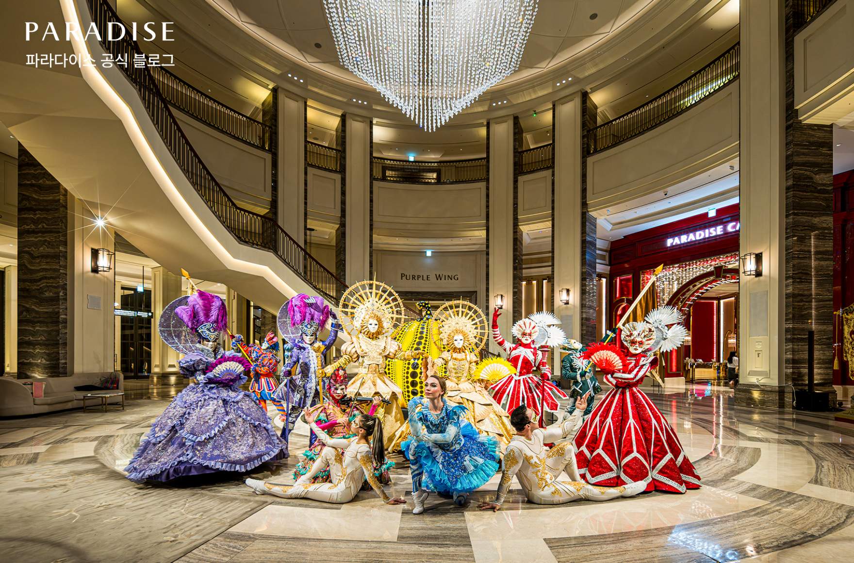 파라다이스시티 메인 호텔 1층 와우존에서는 쿠사마 야요이의 대표작 Great Giant Pumpkin을 배경으로, 화려한 런웨이처럼 연출된 마스커레이드 퍼포먼스 ‘골든 마칭 커레이드 (Golden Marching Querade)’가 펼쳐집니다. 이번 공연은 글로벌 복합 리조트로서 전 세계 다양한 고객이 함께 즐길 수 있도록 예술과 패션이 결합된 런웨이형 가면 무도회를 콘셉트로 기획되었습니다. 공연 무대가 되는 와우존 광장은 생명력을 지닌 ‘황금 호박 꽃’이 피어나는 마법의 공간으로 설정되어 파라다이스시티 메인 호텔의 레드, 퍼플, 골드를 상징하는 퍼포머들의 행진이 극적인 몰입감을 선사합니다. 화려한 가면과 의상을 입은 공연단이 현장 라이브 바이올린 선율과 현대적인 런웨이 비트 위에서 시공간을 초월한 환상의 세계를 그려냅니다. 예술 작품과 퍼포먼스가 완벽하게 어우러진 순간, 파라다이스시티를 찾은 모든 고객에게 잊지 못할 ‘황금빛 마스커레이드의 여운’을 선사합니다.