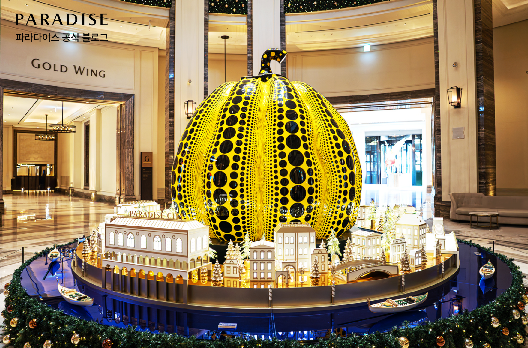 가장 먼저 메인 호텔 1층 와우존을 추천합니다. 쿠사마 야요이의 대표 작품 ‘Great Giant Pumpkin’의 상단부에 수벽 장식이 더해져 고급스럽고 품격 있는 분위기를 자아냅니다. 파라다이스시티 대표 포토존으로 소중한 사람과의 행복한 순간을 사진으로 남겨 보시기 바랍니다. 다음은 이번 시즌 메인 스팟인 플라자 광장입니다. 하늘로 향해 날아오르는 기차 오브제와 내부 관람이 가능한 객실 형태의 장식물이 설치되어 있어 풍성한 크리스마스 분위기를 만끽할 수 있습니다. 12월 24일과 25일에는 외국인 산타와 함께하는 포토타임과 선물 증정 이벤트도 진행해 고객에게 잊지 못할 추억을 선사할 예정입니다.