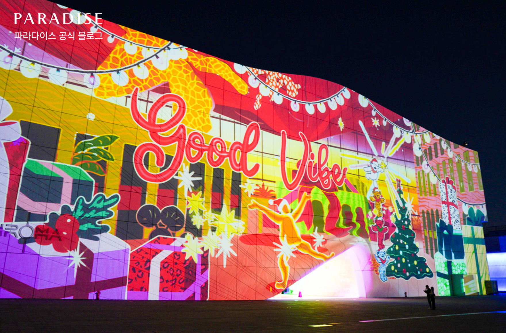 크로마 스퀘어와 아트가든에서는 조엘 메슬러의 작품을 기반으로 한 미디어 파사드 쇼가 겨울밤을 밝힙니다. 외벽 전체에 펼쳐지는 대형 영상은 선명한 컬러와 패턴이 어우러져, 낮과는 다른 분위기의 겨울 풍경을 만들어냅니다. 알록달록한 색감이 돋보여 사진과 영상 촬영하기에도 좋은 대표 포토 스폿입니다. 연말을 기념해 특별 초청 공연과 12월 31일 카운트다운까지 준비되어 있으니 가족, 연인, 친구와 함께 파라다이스시티에서 잊지 못할 추억을 남겨보세요.