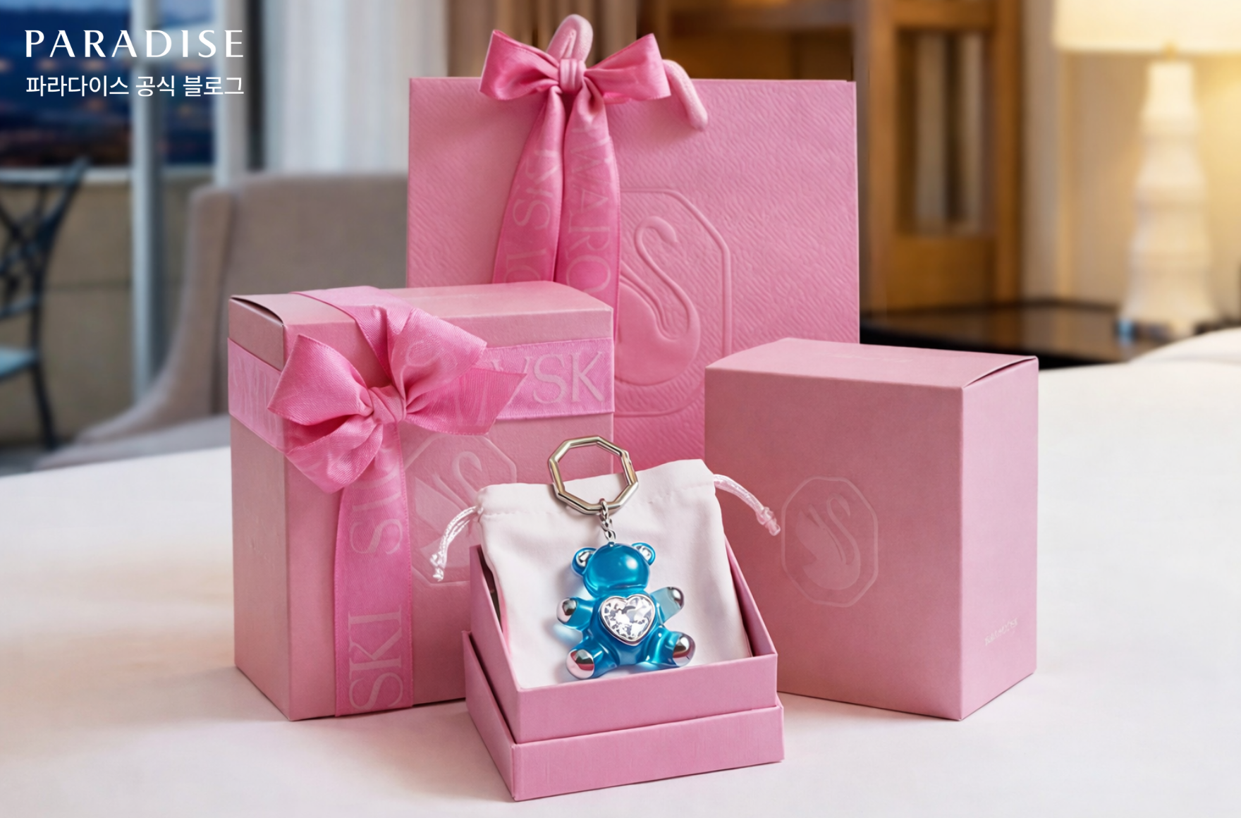 파라다이스시티의 CRYSTAL SWEET STAY는 로맨틱한 호캉스를 원하는 분들에게 어울리는 패키지입니다. 스와로브스키와 함께하는 이 상품은 숙박에 기프트와 디저트 경험을 더해, 머무는 시간을 한층 더 낭만적으로 완성해 주는데요. 투숙 고객에게는 스와로브스키의 사랑스러운 블루 테디 키링이 제공되어, 여행 이후에도 자연스럽게 추억을 이어갈 수 있습니다.