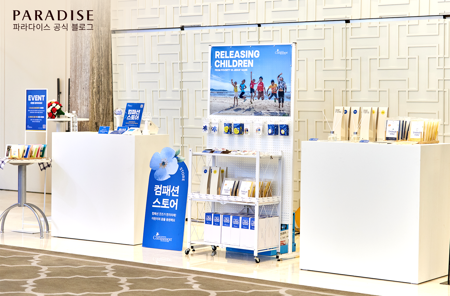 본 공연이 시작되기 전, 파라다이스시티 그랜드볼룸 앞 로비는 나눔을 매개로 한 작은 축제가 열렸습니다. 컴패션의 가치를 전하는 전시, 아기자기하게 꾸며진 굿즈 부스, 그리고 관객들이 직접 참여하며 즐길 수 있는 이벤트들로 가득 채워졌습니다.