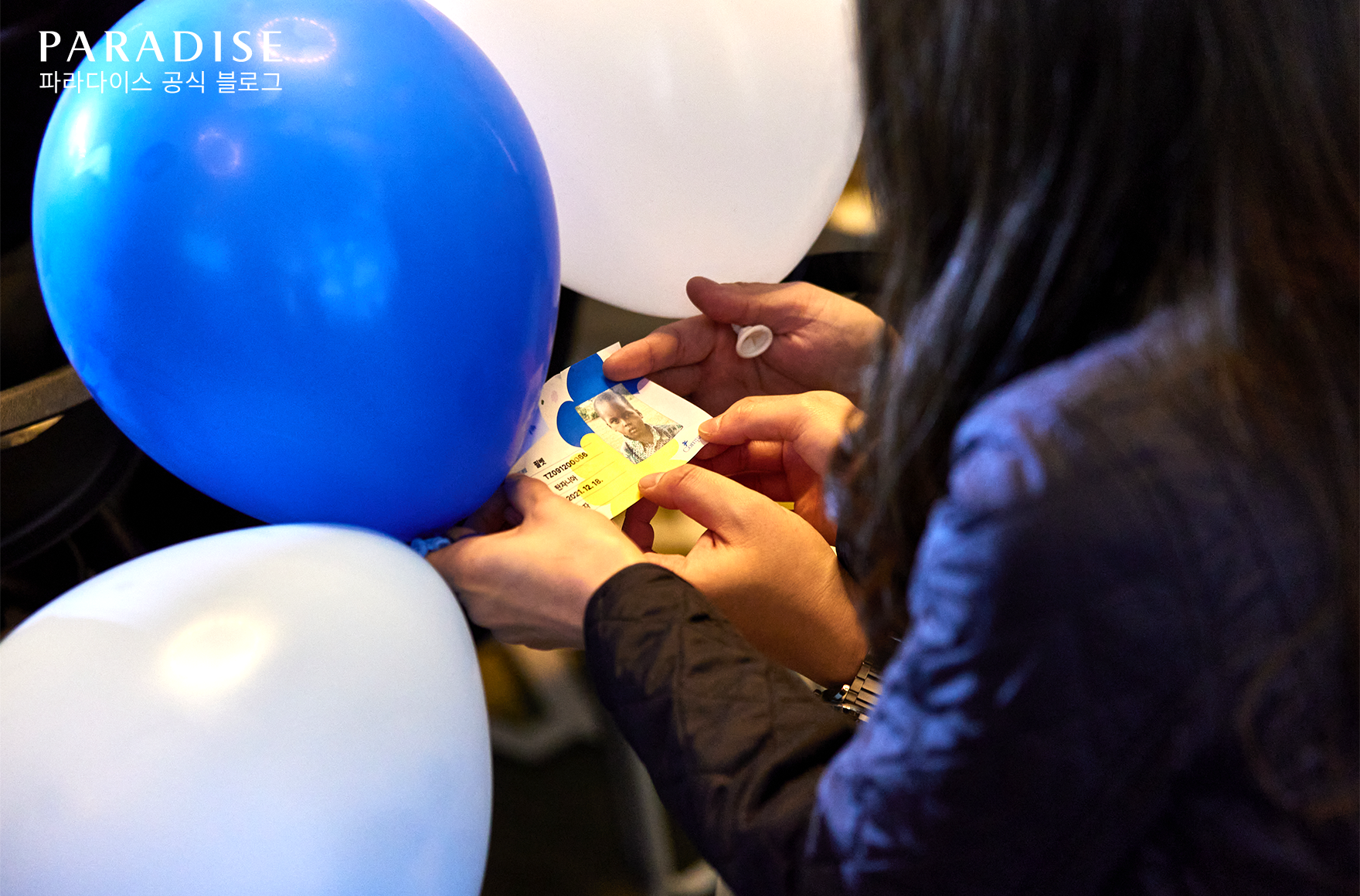 꽃서트의 하이라이트이자 핵심 테마인 ‘짝꿍’의 의미를 시각적으로 전하기 위해 높은 천장에서 수많은 파란 풍선들이 마치 꽃잎처럼 쏟아져 내리는 장관이 연출되었습니다. 풍선 안에는 후원을 기다리는 어린이들의 사진과 정보가 담긴 카드가 숨겨져 있었고, 관객들은 자신에게 닿은 풍선을 열게 되면 한 어린이의 이야기를 마주하게 되었죠. 이어 결연 신청서를 작성하며, 기꺼이 그 어린이의 새로운 ‘짝꿍’이 되어주기도 했습니다.