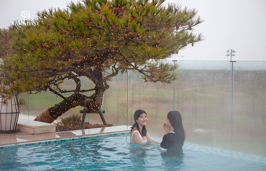 이번에는 야외에 있는 3층 인피니티풀에서 스파를 즐겨볼 시간! 한겨울에 즐기는 따뜻한 인피니티풀은 이 계절에만 만날 수 있는 특별한 순간인데요. 찬 공기를 마시며 따뜻한 물에 몸을 담그고 있으면 해묵은 스트레스가 절로 녹아 없어지는 듯한 기분입니다. 이곳은 펼쳐진 하늘과 전경이 어우러져 특별한 분위기를 만들어 주는데요. 특히 석양이 지는 시간이나 비행기가 지나가는 순간을 노린다면 인생 사진도 얻을 수 있죠.