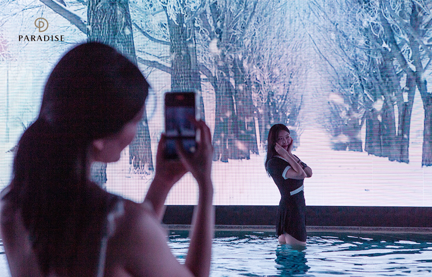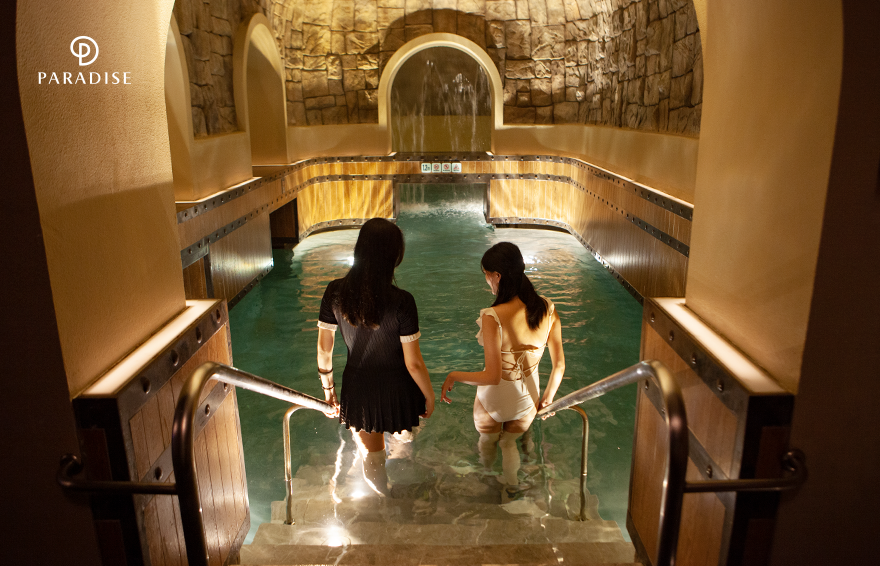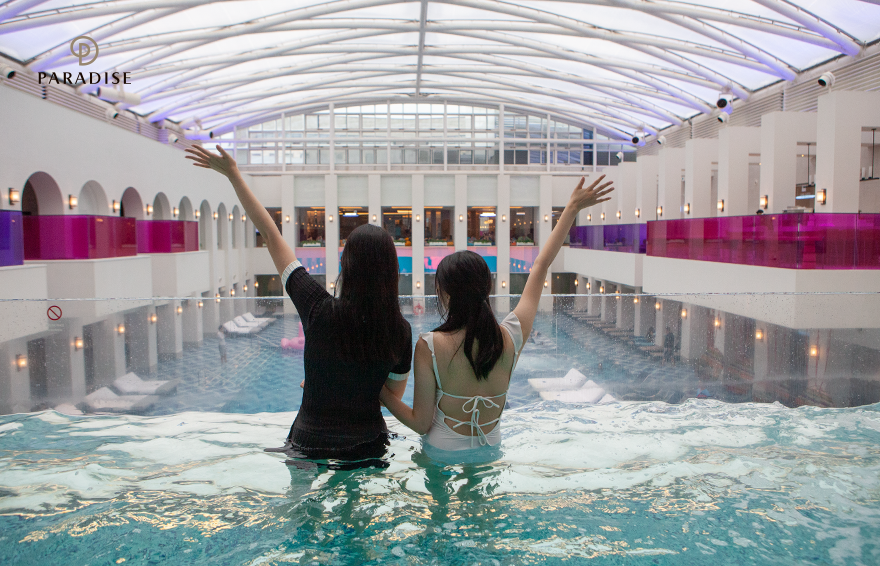 수영복으로 환복한 후, 씨메르에 입장하자마자 해외로 순간 이동한 것처럼 이국적인 풍경이 펼쳐집니다. 씨메르 1층에서 만나볼 수 있는 이곳은 탁 트인 돔 형태의 천장과 트렌디한 인테리어를 자랑하는 워터플라자인데요. 따뜻하고 쾌적한 환경과 럭셔리한 공간에 두 사람은 설렘을 감추지 못했습니다. 파라다이스 씨메르는 모든 정규 직원이 수상 안전요원, 생존수영 지도자 등 관련 자격증을 보유하고 있어 이용 고객이 안심하고 안전하게 물놀이를 즐길 수 있는데요. 두 사람 또한 1층과 2층 인도어 인피니티 풀을 오가며 아쿠아 스파를 마음껏 즐겼습니다.