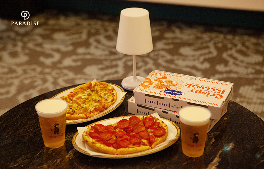 잠시 출출해진 두 파라디안은 인피니티풀 바로 옆에 자리한 인피니티바8으로 자리를 옮겼습니다. 마치 고급스러운 바에 온 것 같은 잔잔한 음악이 흐르는 이 곳에서 두 사람은 시그니처인 고피자와 오비 맥주를 주문했습니다. 크리이지미트와 페퍼로니 두 종류로 구성된 고 피자는 치즈와 토핑이 가득해 입안을 풍성하게 채워주었는데요. 갓 구워 나온 따뜻한 피자와 시원한 맥주의 궁합은 두 사람에게 또 다른 힐링을 선사했습니다. 신나게 물놀이를 즐기고 이제 따끈따끈한 K-style의 휴식이 그리워진 이들은 2층 찜질 스파 존으로 향했습니다.