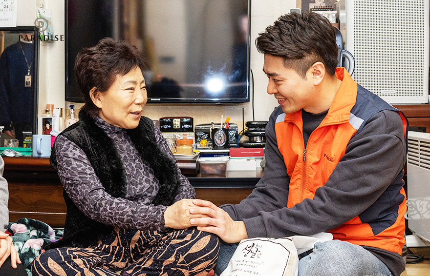 식사 정리가 마무리된 후에는 설 선물 세트 전달이 이어졌습니다. 어르신들을 위한 파라다이스의 마음이 담긴 쌀과 김 세트였는데요. 거동이 불편하시거나 사정이 있어 복지관에 오지 못한 어르신들을 위해서 파라다이스 임직원이 직접 찾아 뵈었습니다. 일일 봉사자들은 선물을 드리며 어르신들과 담소를 나누는 등 소중한 시간을 함께 보내기도 했죠. 이야기를 나누며 서로 맞잡은 두 손에서 서로에 대한 따스한 마음이 오고 갔습니다.